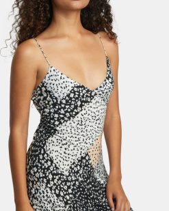 Tyto midi šaty s potištěným šikmým střihem, vyrobené ze saténově hladké modalové látky, mají výstřih do V a překřížený detail zavazování na zádech. buďte ležérní, nebo si je upravte na večer.